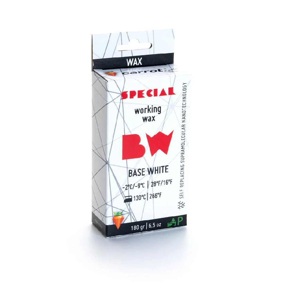 Carrot Base White Valla som är speciellt framtagen för service, träning och grund till andra vallor. Ger högglansig yta på belaget. Carrots mest sålda valla. Snötemperatur -2 / -9 grader 180 gram
